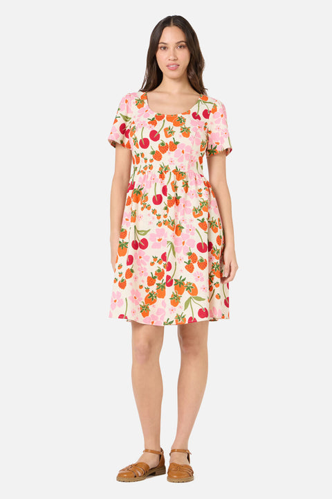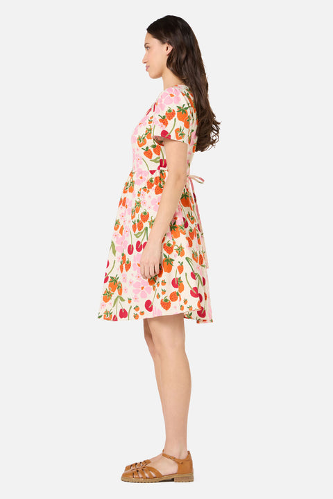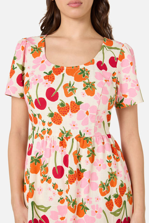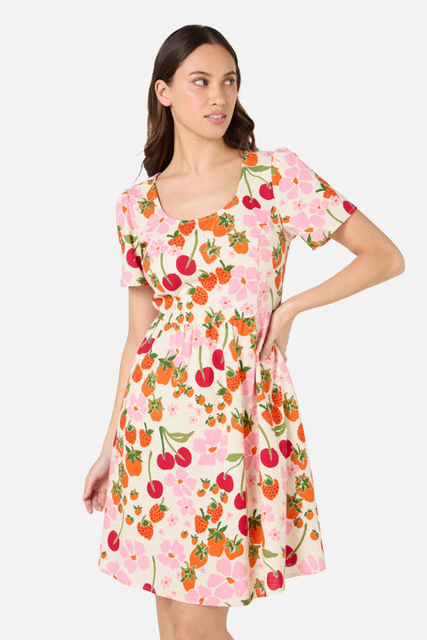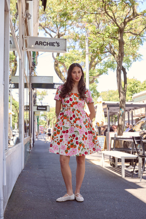 A sweet summer mini dress in soft cream, featuring a charming hand-painted print of fresh cherries, strawberries, and daisies. Light, playful, and picnic-perfect, this style blends vintage-inspired sweetness with effortless warm-weather wear.