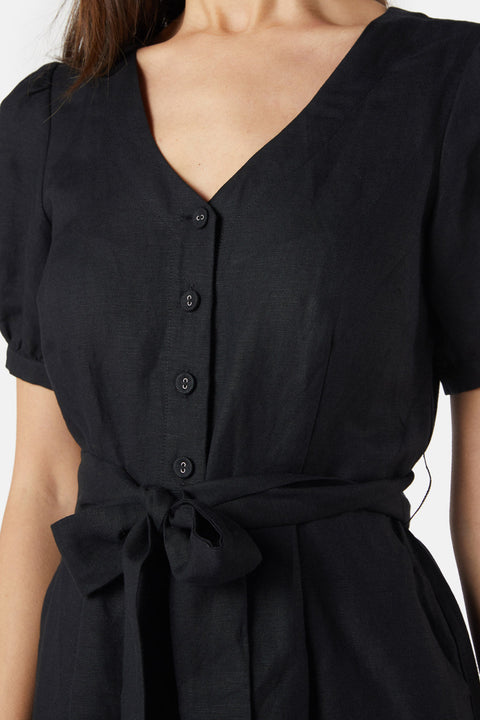Slip into the Bianca Playsuit when you mean business – but only if that business involves stealing the spotlight with killer style. This isn’t your average playsuit; it’s a black beauty with a V-neckline that plunges just enough to say hello, and a button-through front to keep things interesting. The short puff sleeves add a dash of drama, while the large darts cinch the waist for that oh-so-flattering fit we all crave. The trick doesn’t stop there: with a short length and wide-cut leg, your legs look like they go on for days, and the handy side pockets mean your essentials are always within reach (because who doesn’t love pockets ). Crafted from a premium linen cotton blend fabric, the Bianca Playsuit is your new go-to for turning heads while keeping cool. Whether it’s a brunch date or a night out with the girls, it’s about to become your closet’s most valuable player.