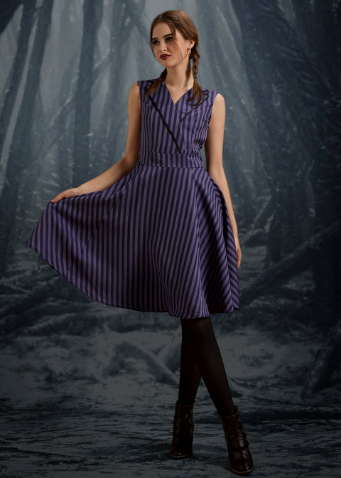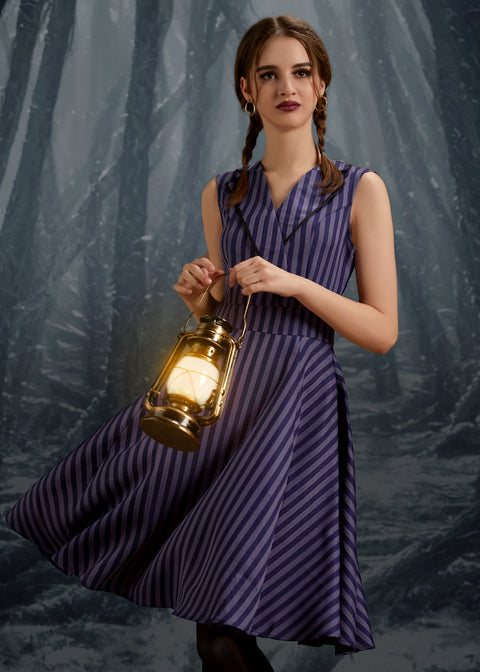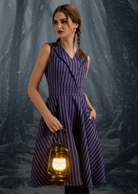 Make a statement in stripes with the Black& Purple Stripe Swing Dress by Orchid Bloom. Featuring a striking combination of black and purple vertical stripes, this vintage-inspired swing silhouette adds a pop of personality to your wardrobe.
