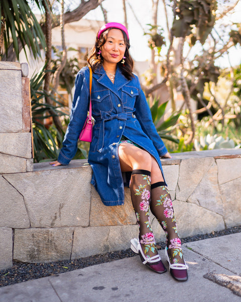 Our bestselling English Rose black sheer sock is now available in knee high length! Make a statement for Spring with pink roses that go all the way up to the knee, set against black sheer fabric for a sophisticated, Parisian chic vibe. Bring bold, whimsical charm to your Spring wardrobe with more of the print you love.