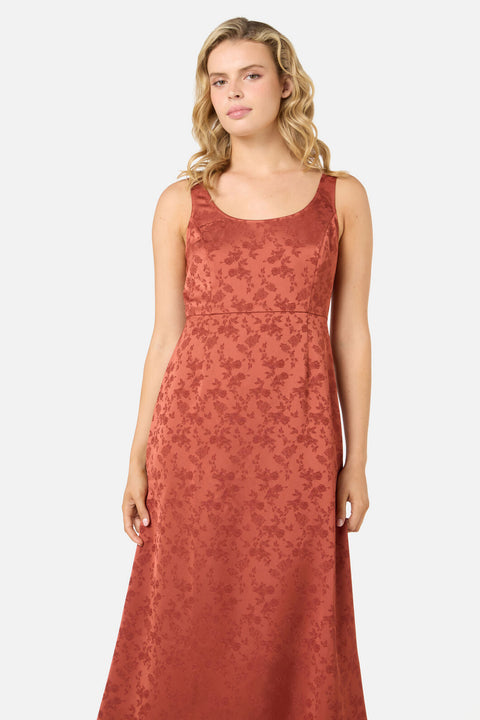Slip into a touch of ’90s nostalgia with the Roma Satin Embossed Midi Dress. Crafted from silky floral-embossed satin, this midi-length slip dress features a scoop neckline, flattering under-bust seam, and soft A-line skirt for an effortlessly elegant silhouette.