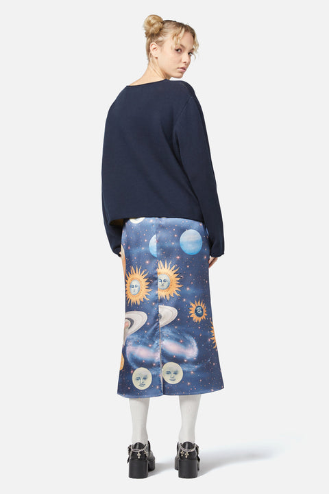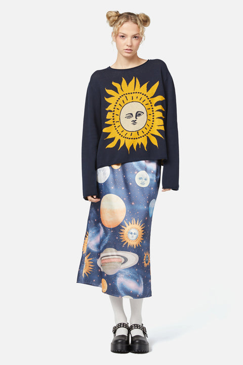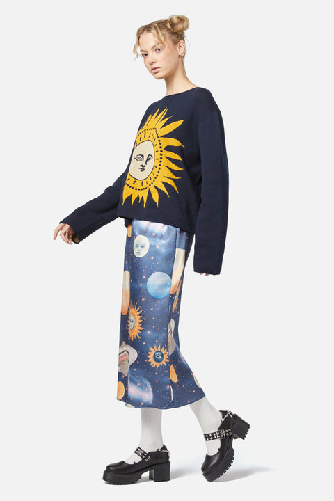 A nod to 90s nostalgia, this boxy fit knit brings bold energy to your wardrobe with its statement intarsia artwork and rolled collar design.