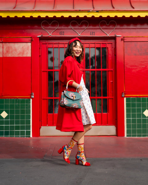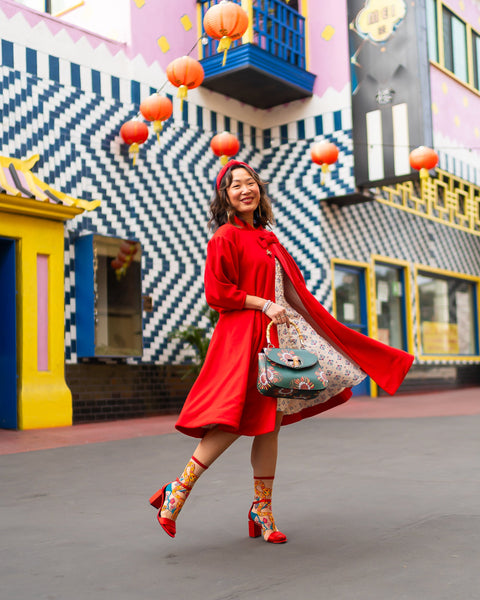Celebrate Lunar New Year 2025 with our festive Year of the Snake sheer sock. Featuring two yellow snakes with floral patterns in red and turquoise, intertwined to form an abstract heart shape and surrounded by turquoise branches and larger flowers. This sock looks just as stunning from the side as it does from the front, making it an unforgettable showstopper. Pair with red heels for the perfect Lunar New Year look.